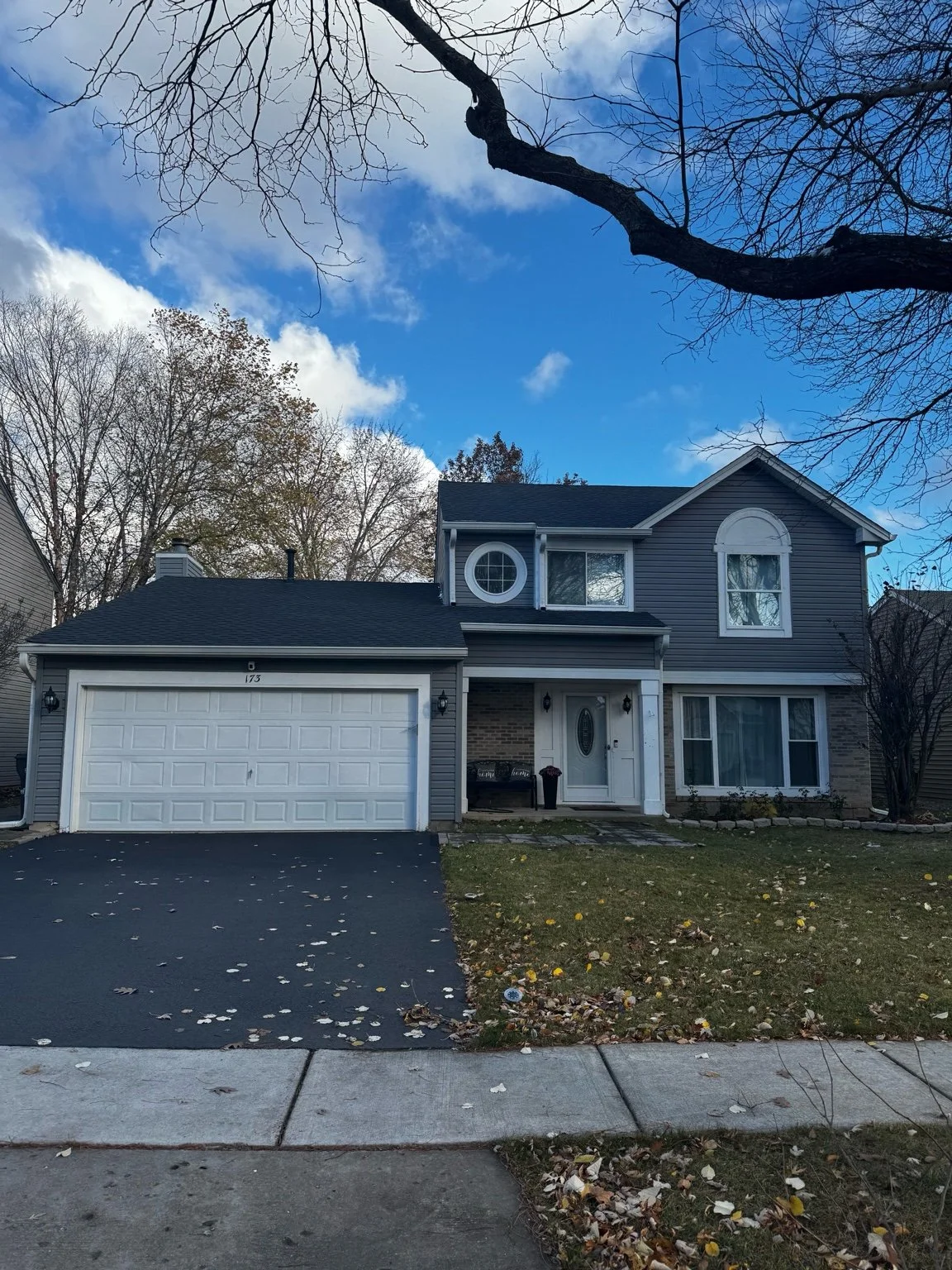 A two-story house with blue siding, white trim, and a two-car garage, with leafless trees and a blue sky with clouds in the background. Fallen leaves are scattered on the driveway and lawn.
